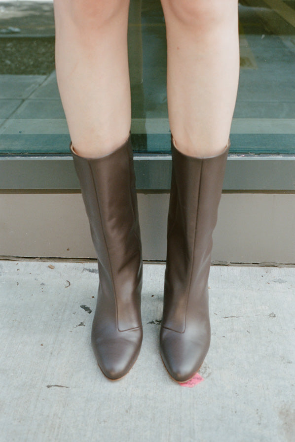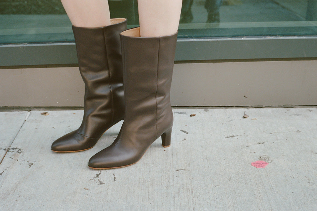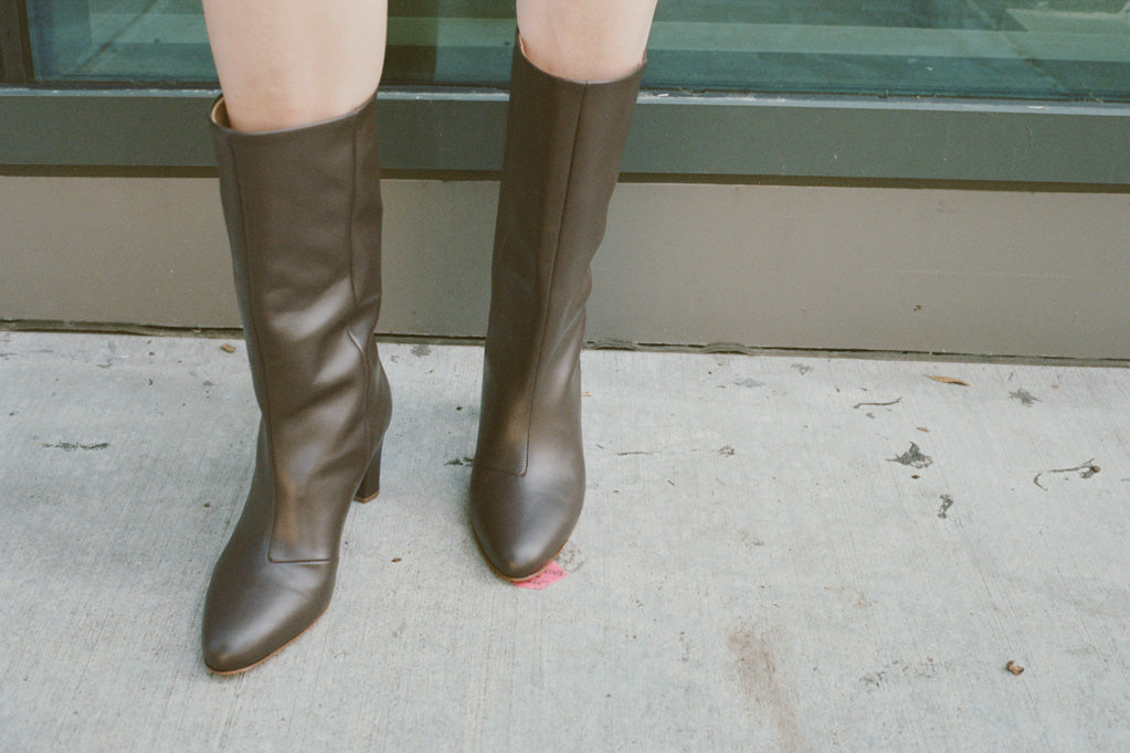 Heeled boot with almond shaped toe. Hits mid calf. 3in heel. True to size.