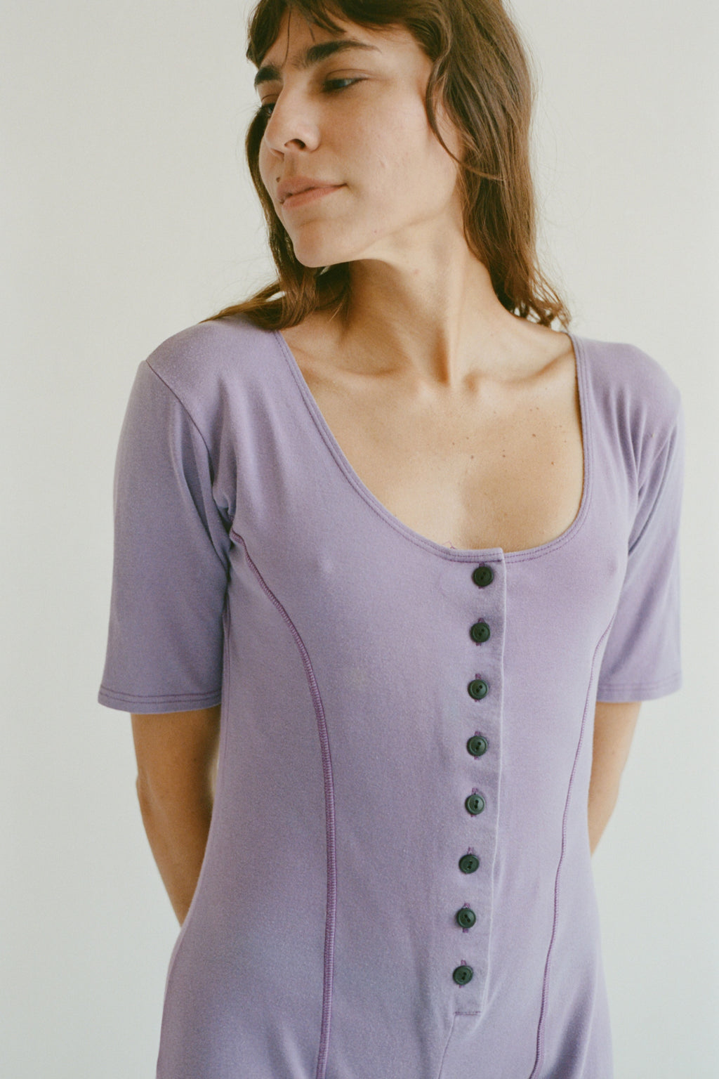 Ann Christine jumpsuit in purple stretch jersey. Sun-faded with slight discoloration around chest.