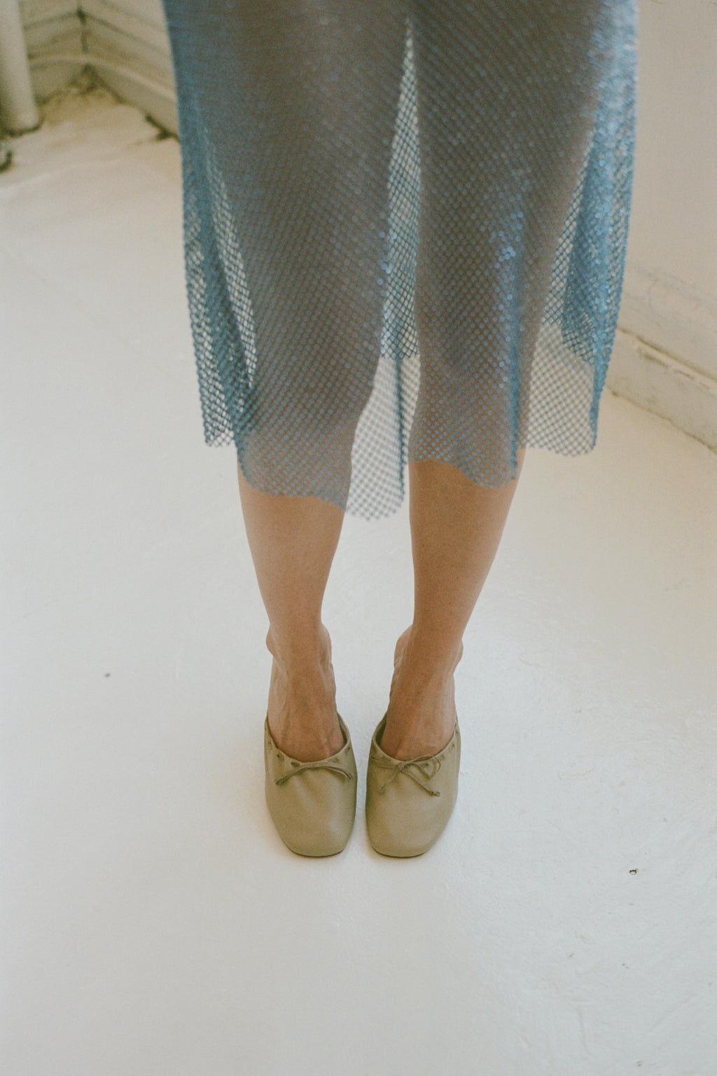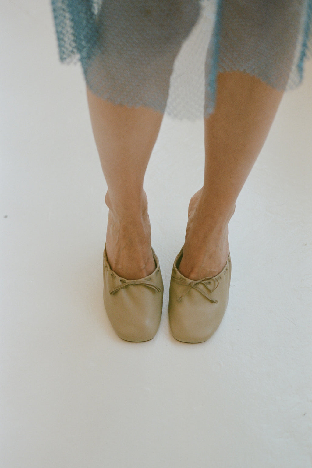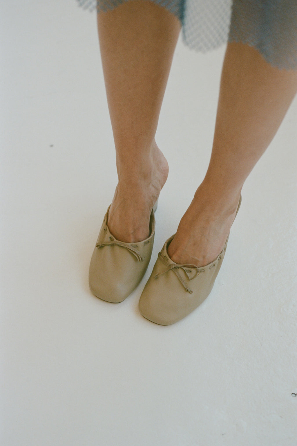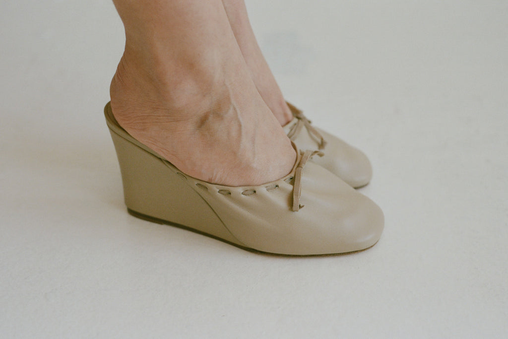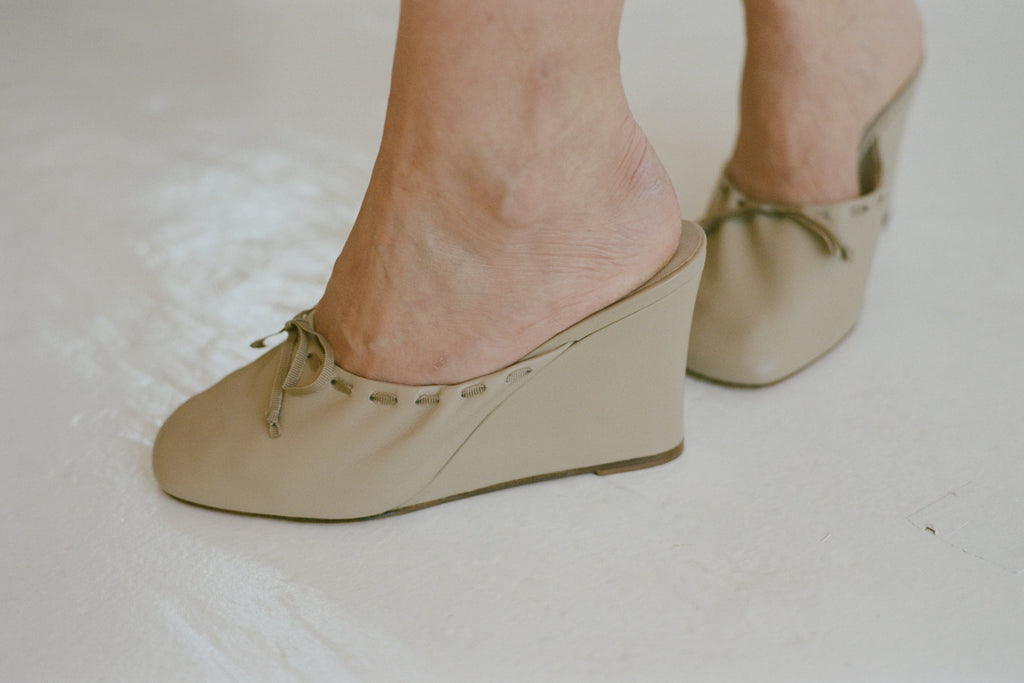 A closed toe leather slide, with a wedge heel and silk ribbon. 8cm heel. Fits true to size.