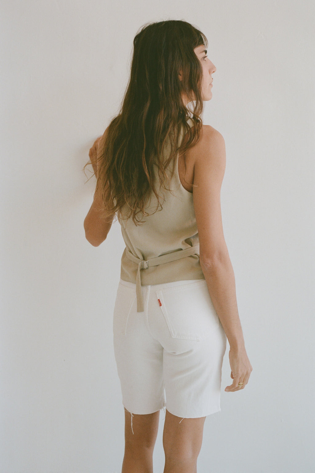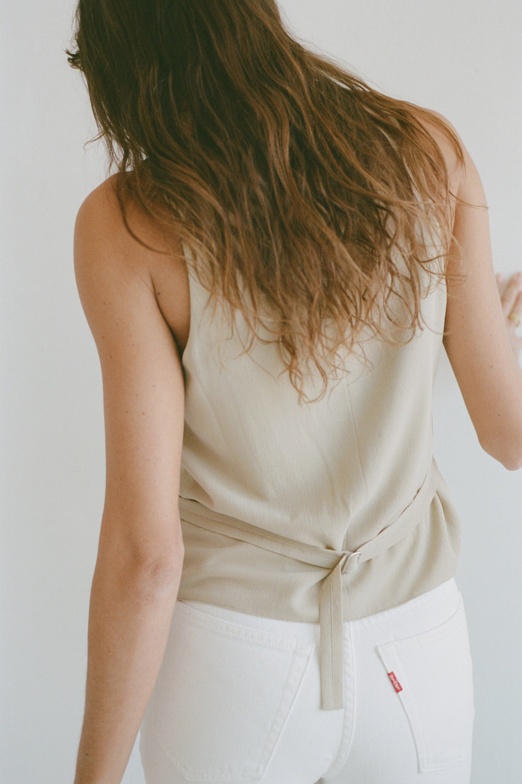 Vintage tan corduroy vest with belted back.