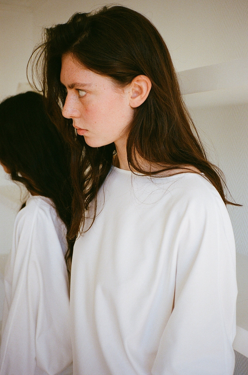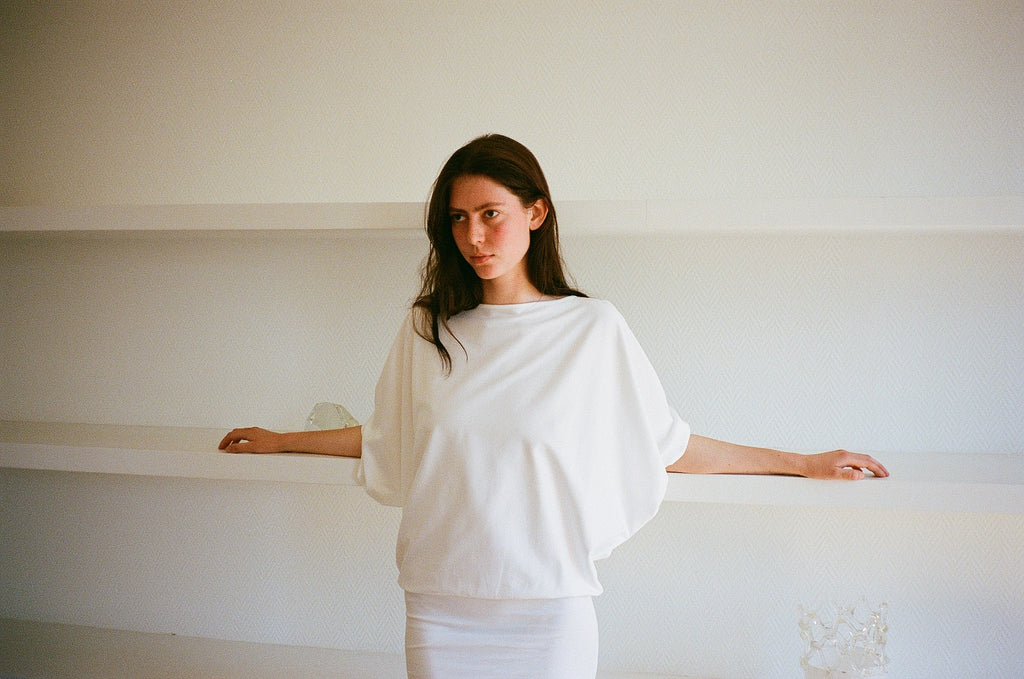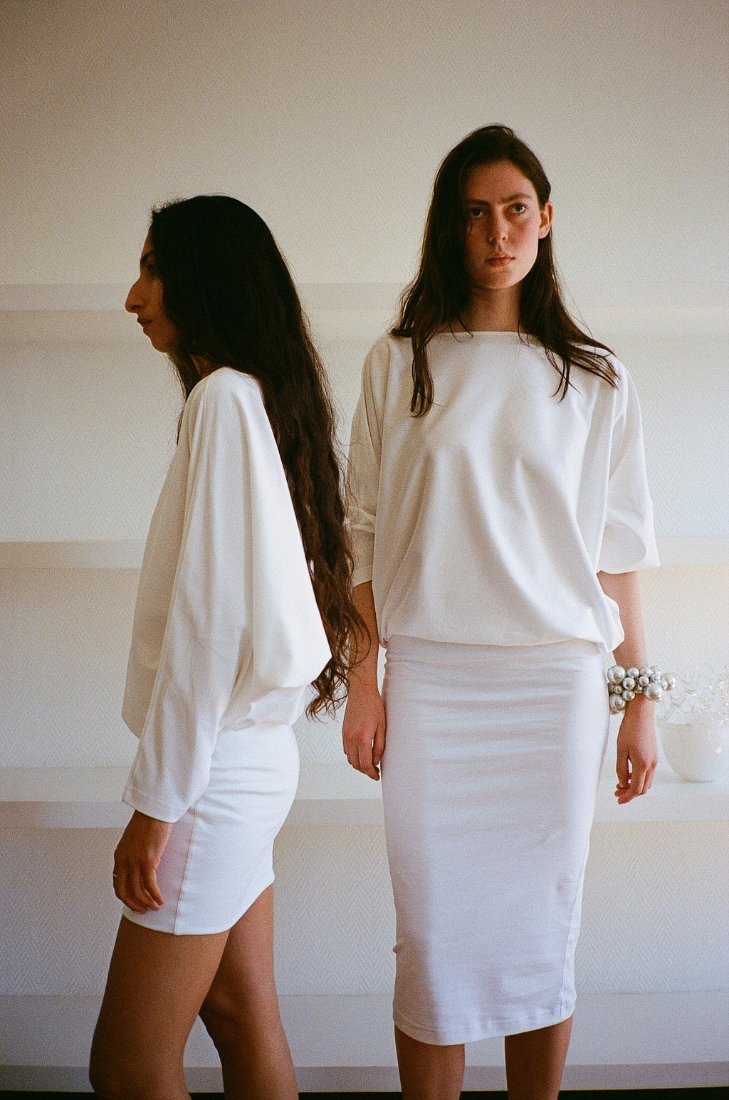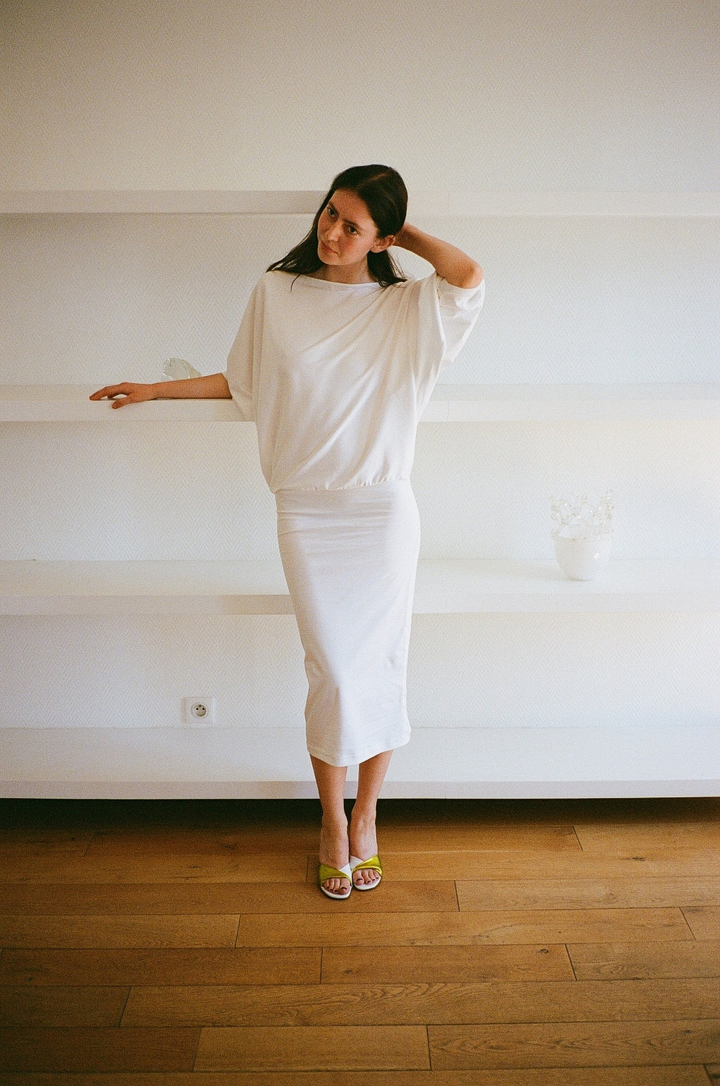 A mid calf length draped dress, fitted at the hips with a wrap belt, long sleeved and straight neck.