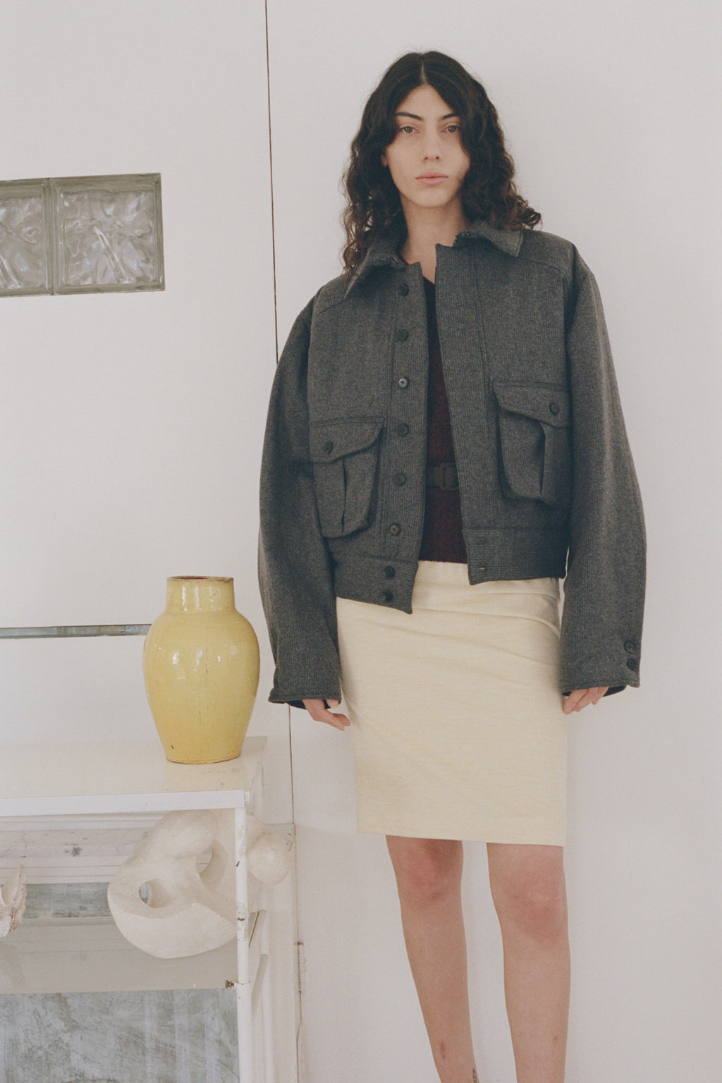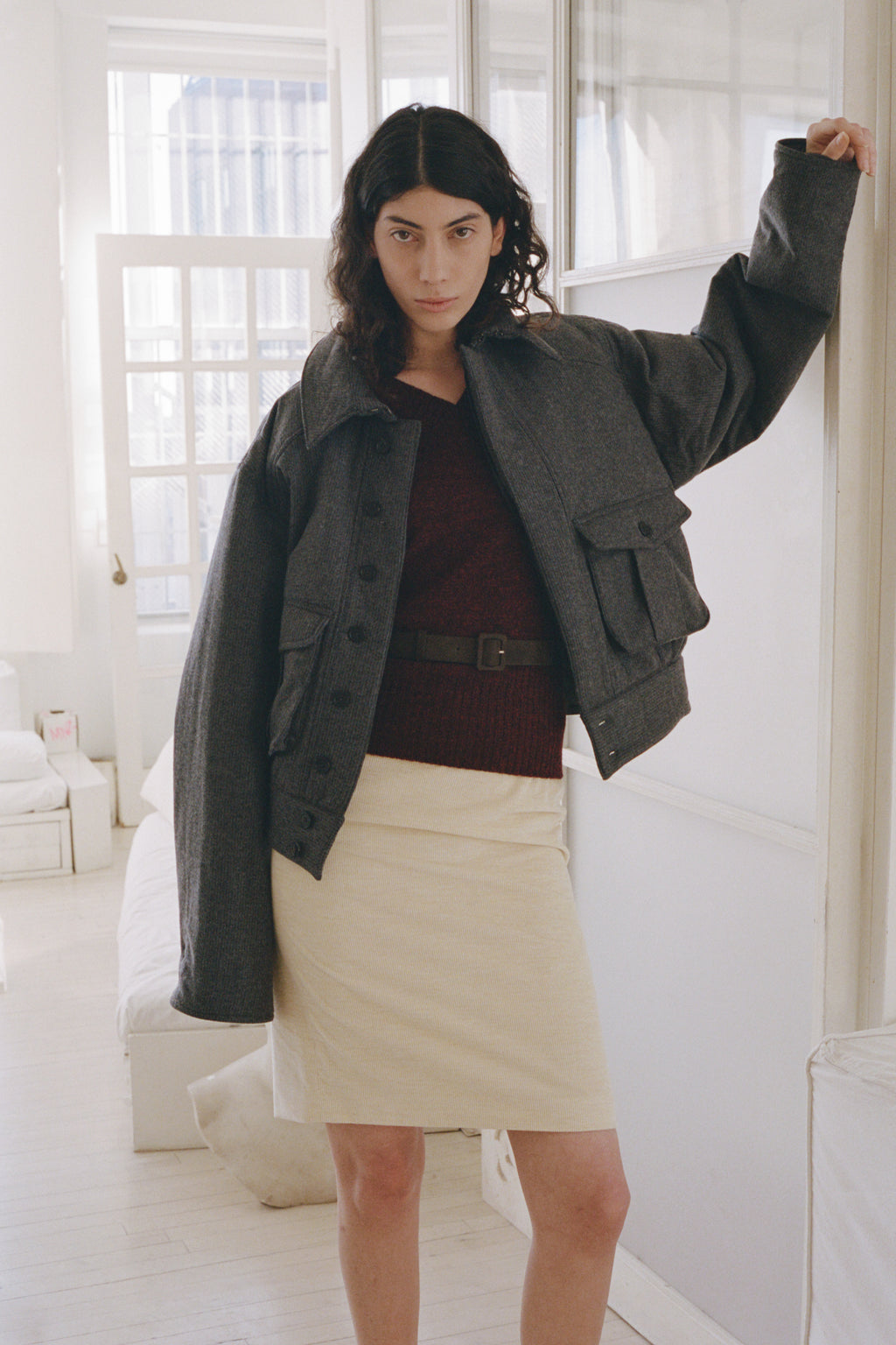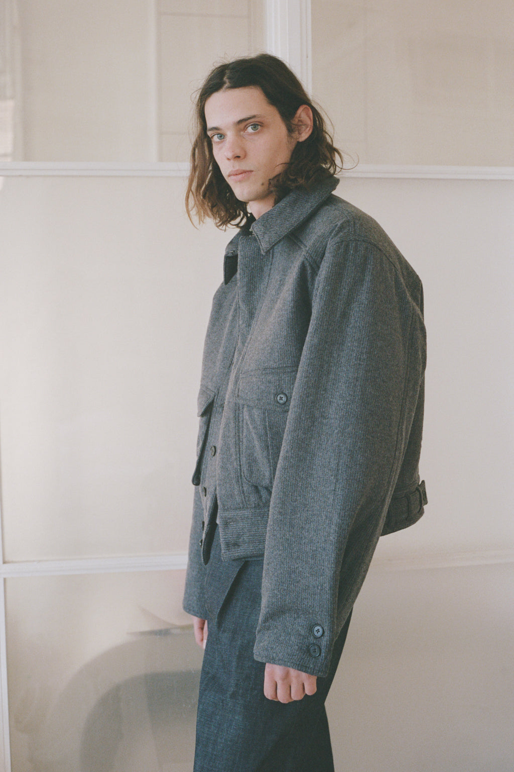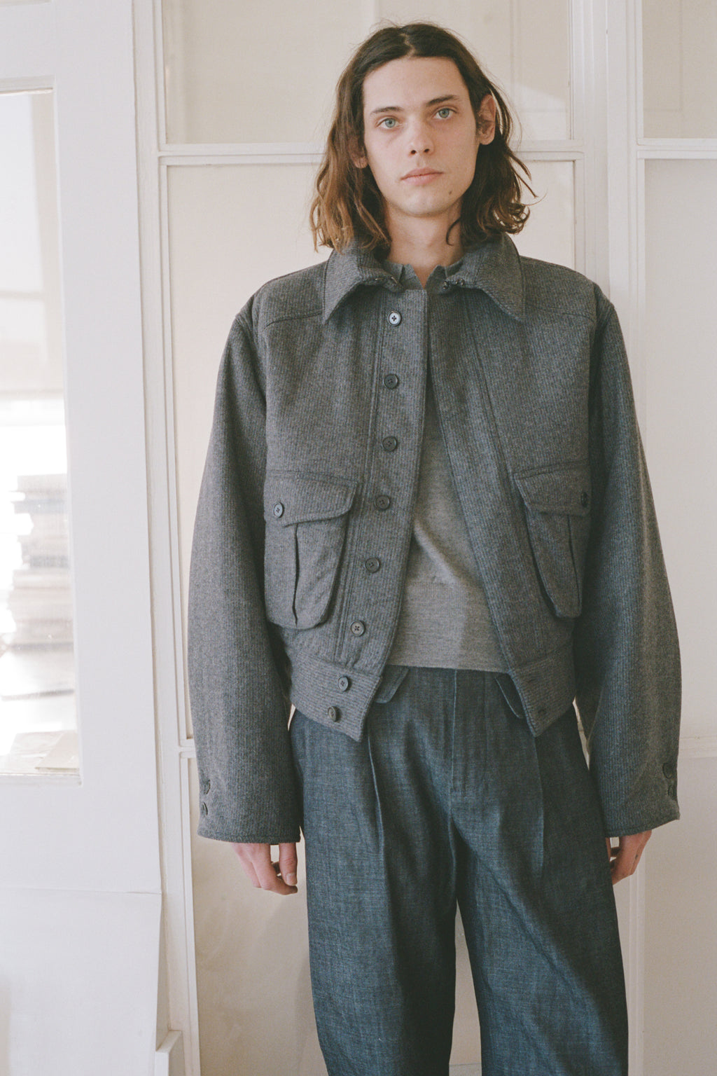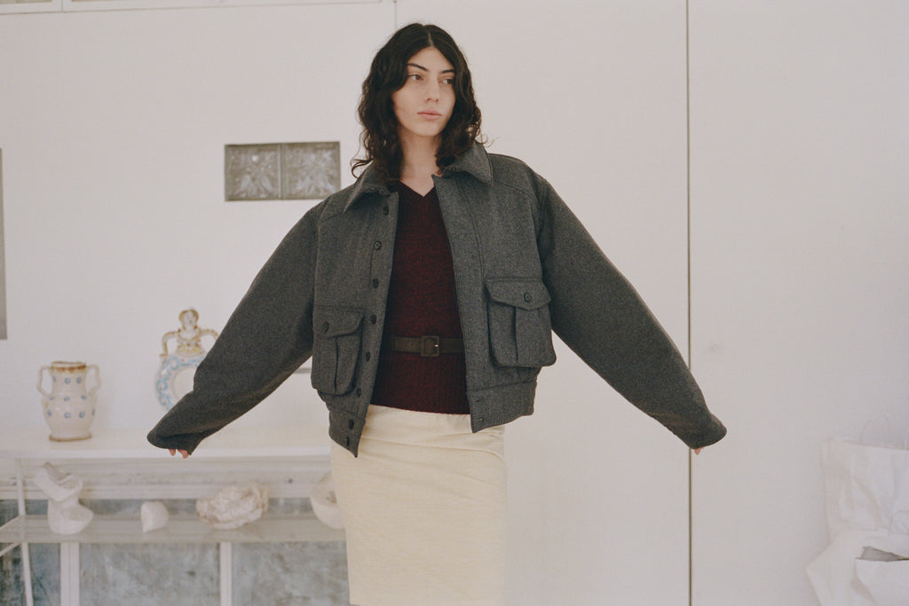 An oversized bomber-inspired jacket with classic collar, concealed button closure, two front patch-style pockets and epaulet shoulder detail.