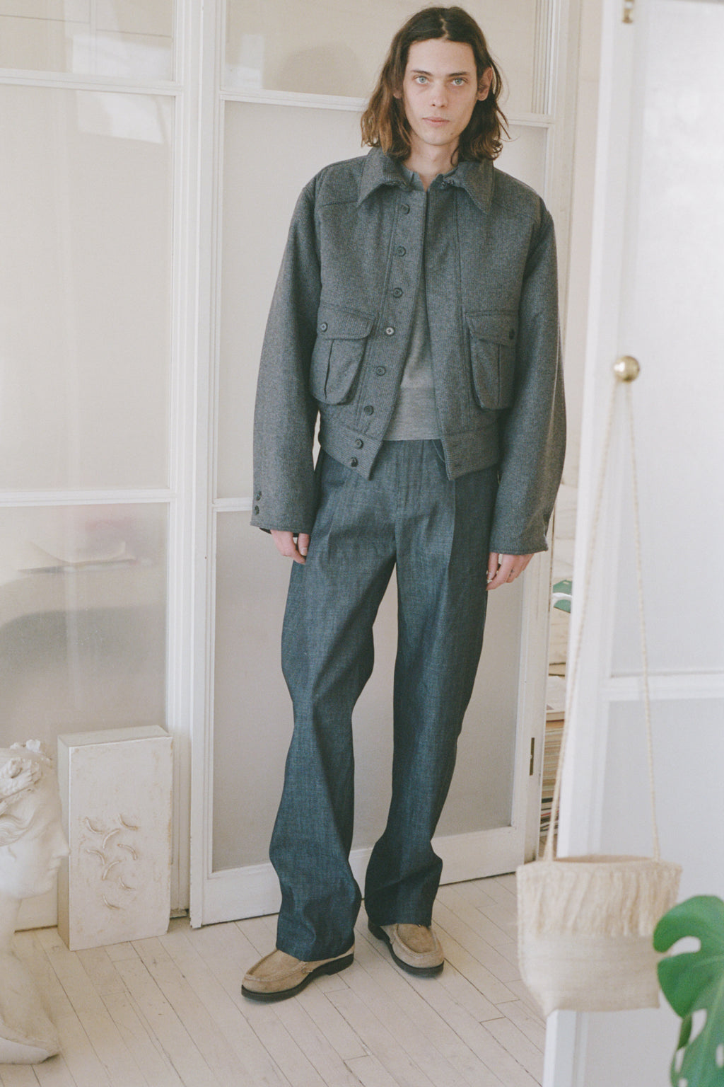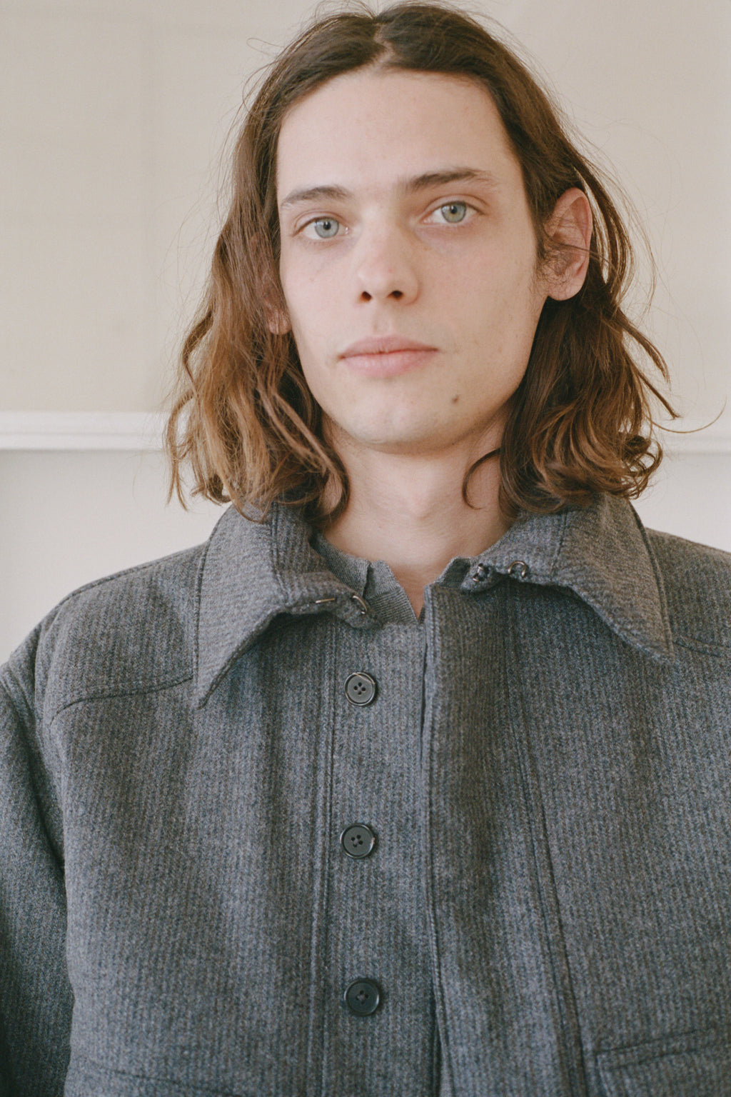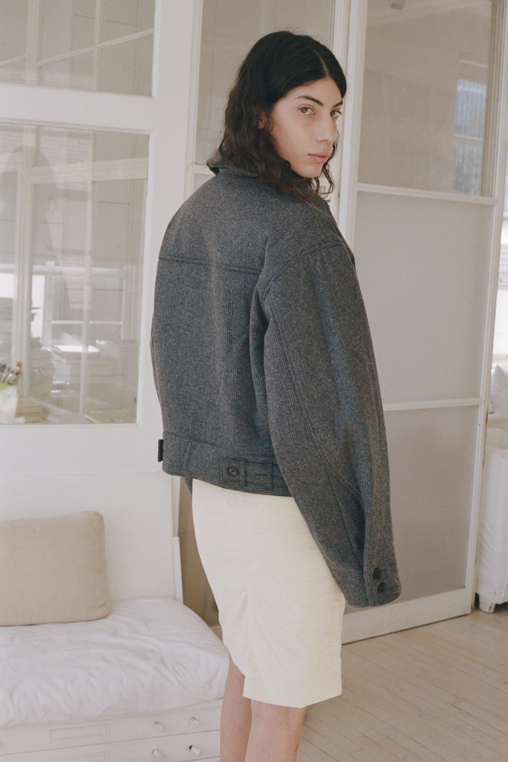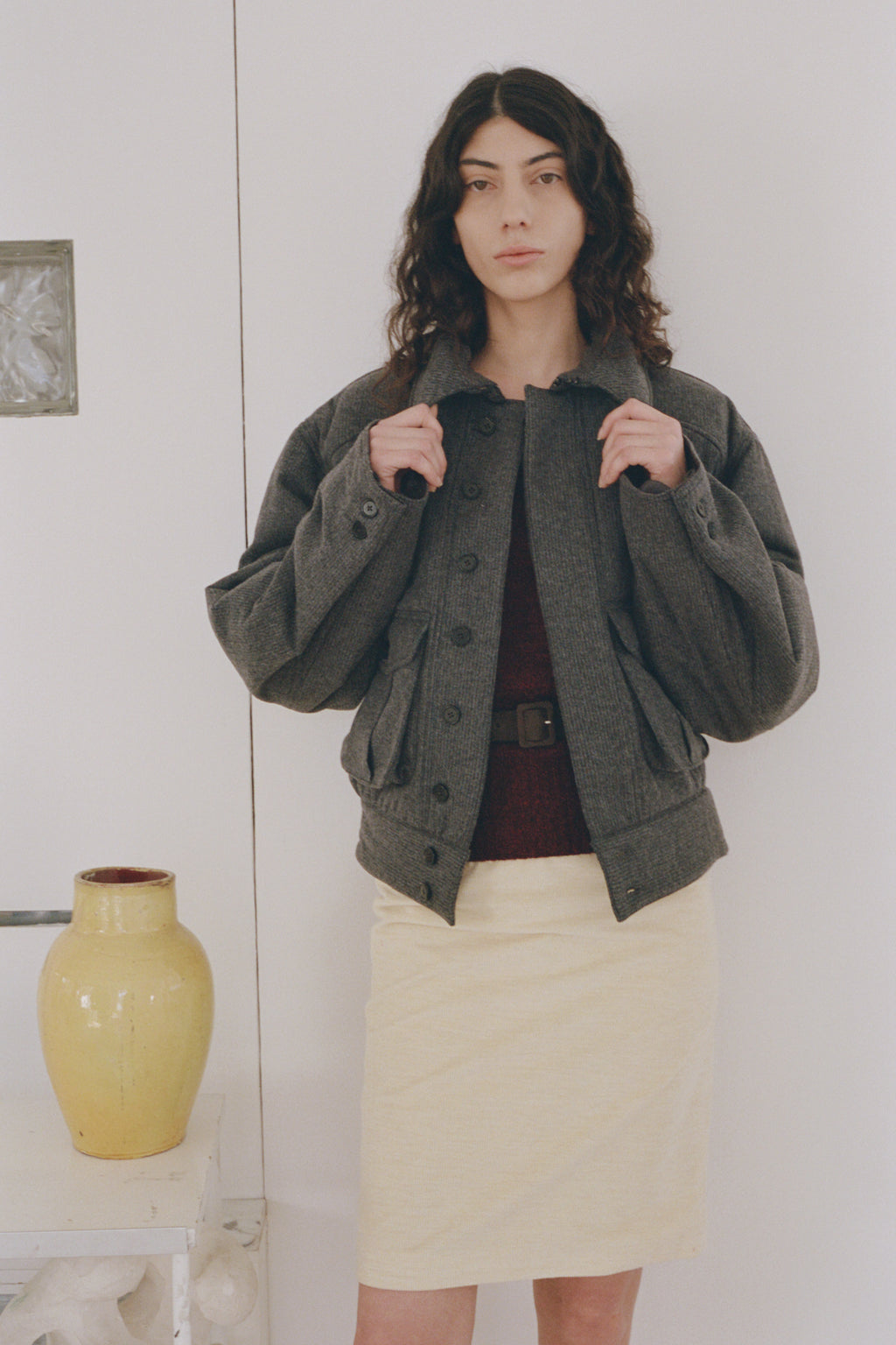 An oversized bomber-inspired jacket with classic collar, concealed button closure, two front patch-style pockets and epaulet shoulder detail.