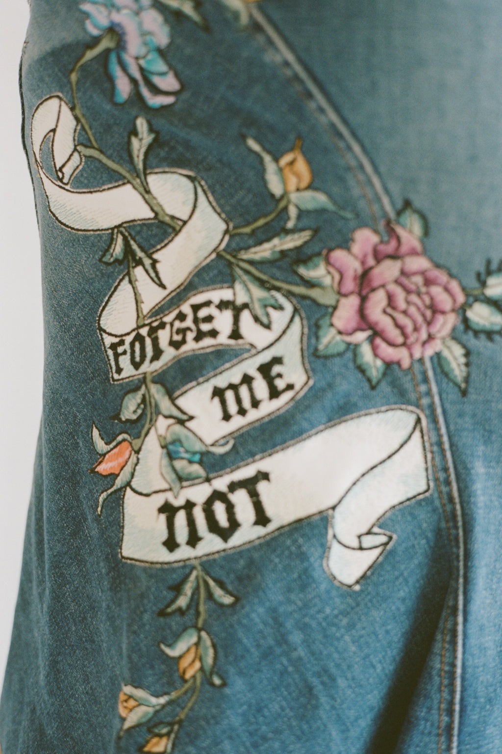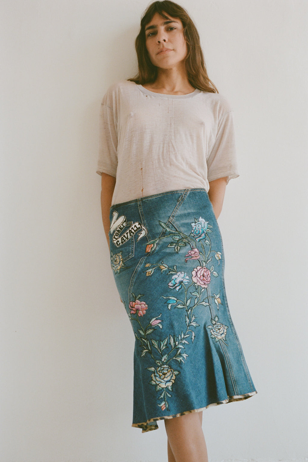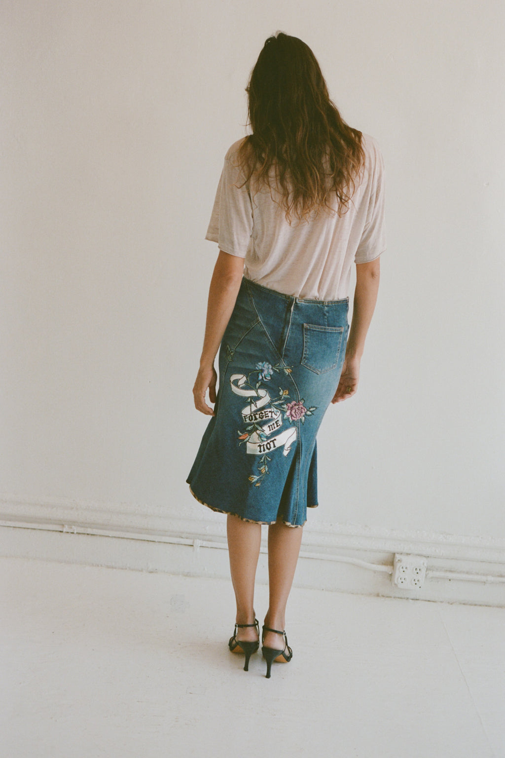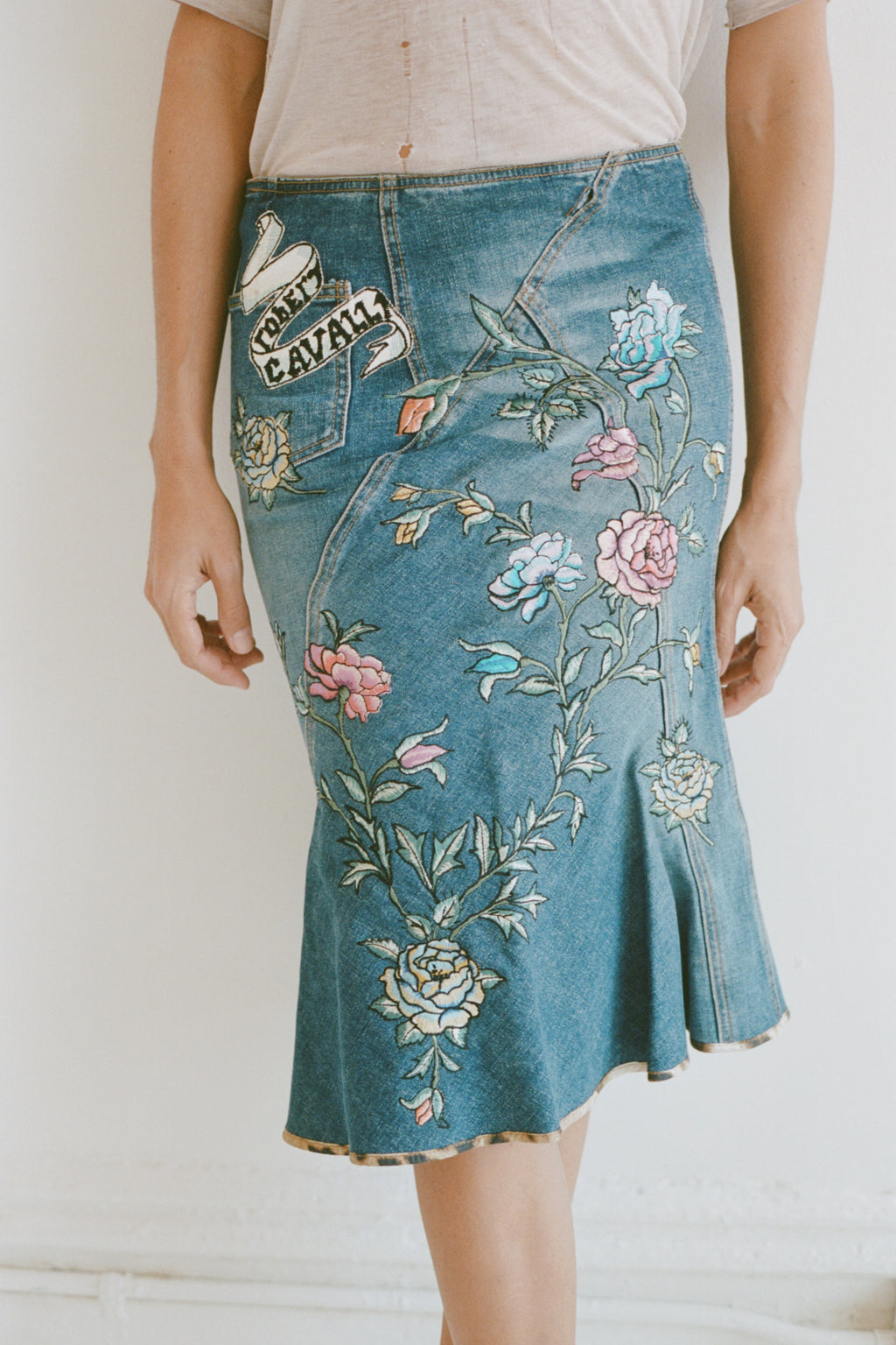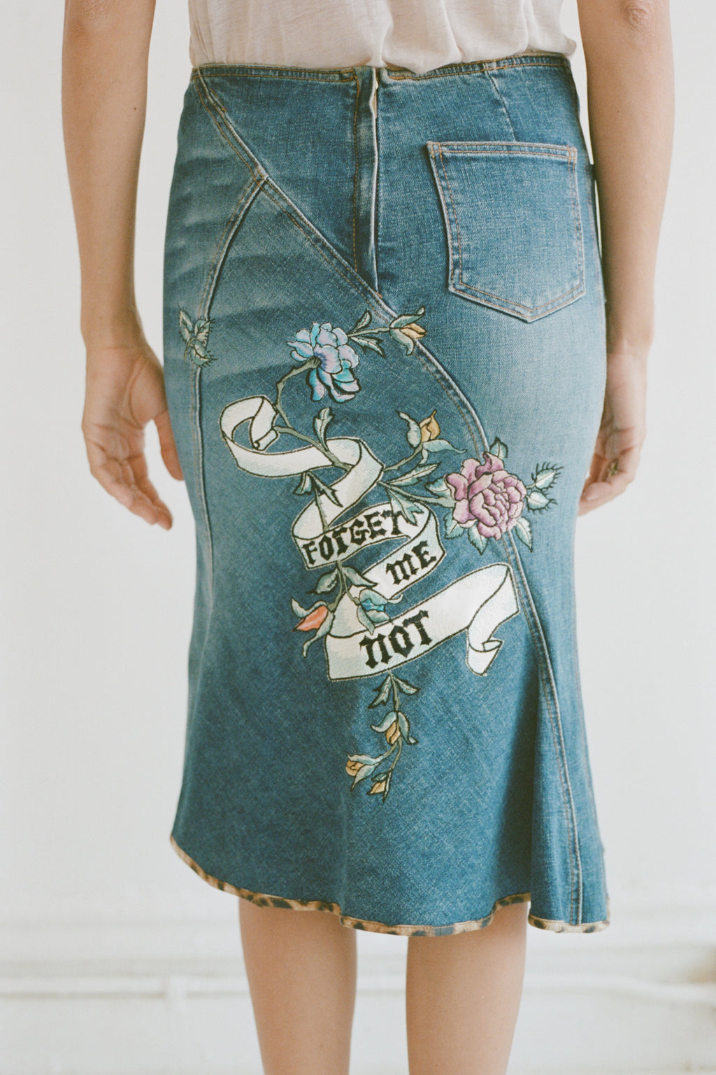 Vintage denim mermaid midi skirt from Roberto Cavalli with "Forget Me Not" embroidery throughout and leopard trim on hem.