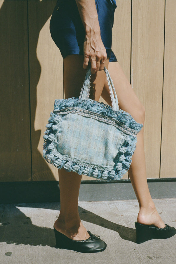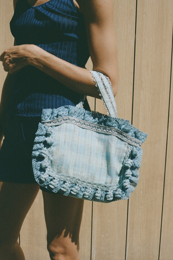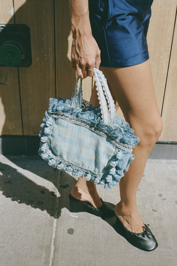 A mid-sized, square handle bag with lace trimmings on the frame and handles. Soft shell.